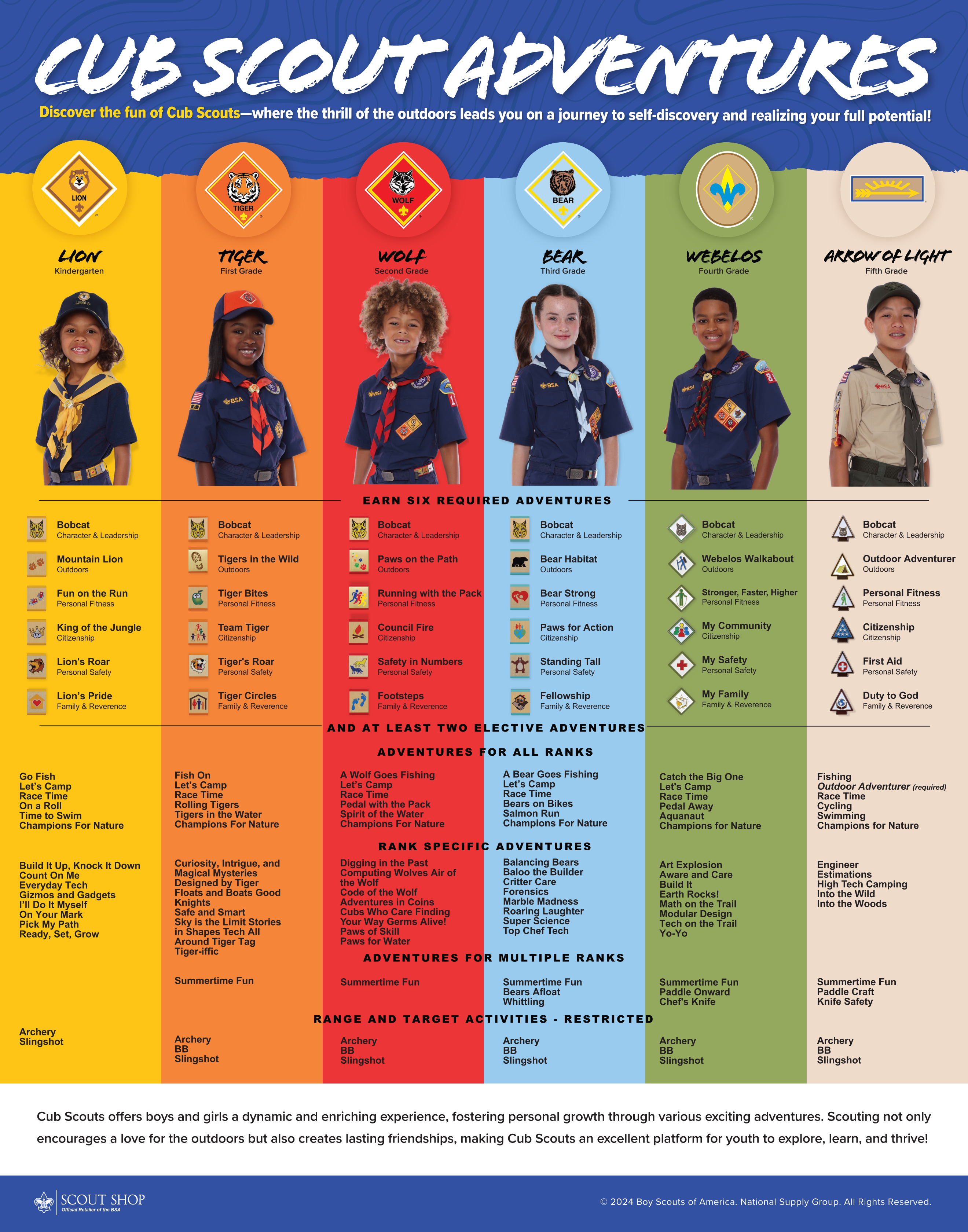 Cub scouts advance through the ranks by completing Adventures. For each rank, Scouts must complete 6 REQUIRED Adventures and 2 ELECTIVE Adventures.